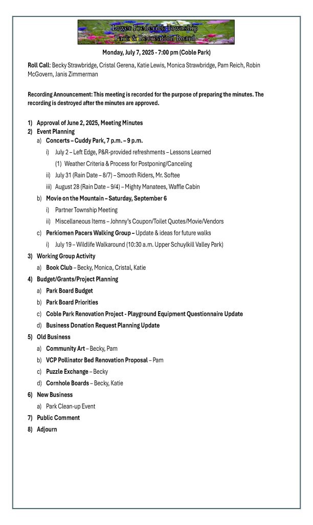 7:00pm Park & Recreation Board Meeting -at Coble Park