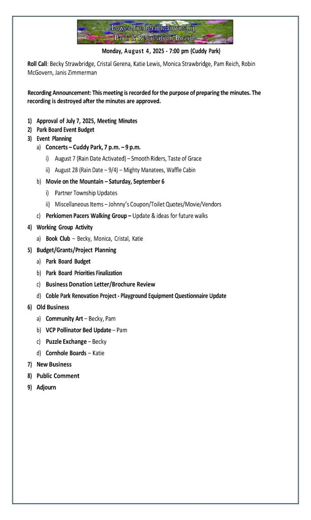 7:00pm Park & Recreation Board Meeting-Cuddy Park